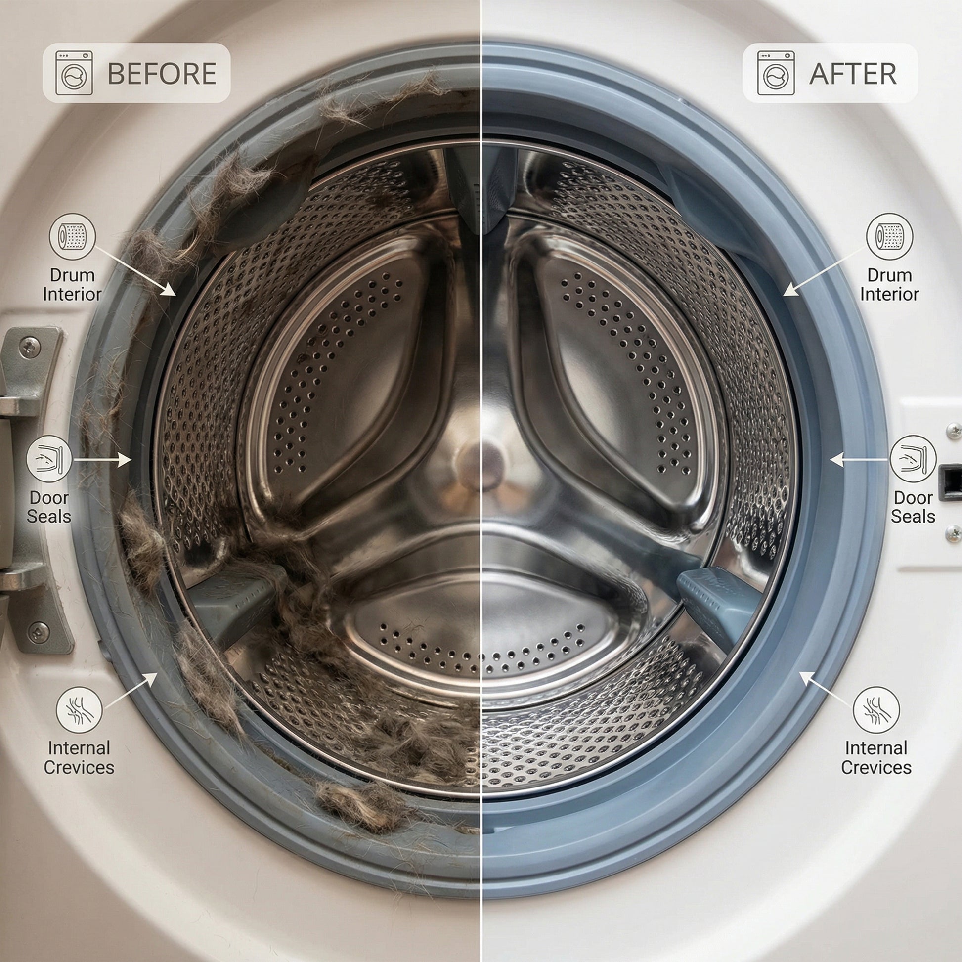 When hair and residue don’t collect inside the machine, fewer particles get redeposited onto clothes — helping reduce dander, lint, and wash-cycle buildup on fabrics. This can also reduce potential allergy triggers.